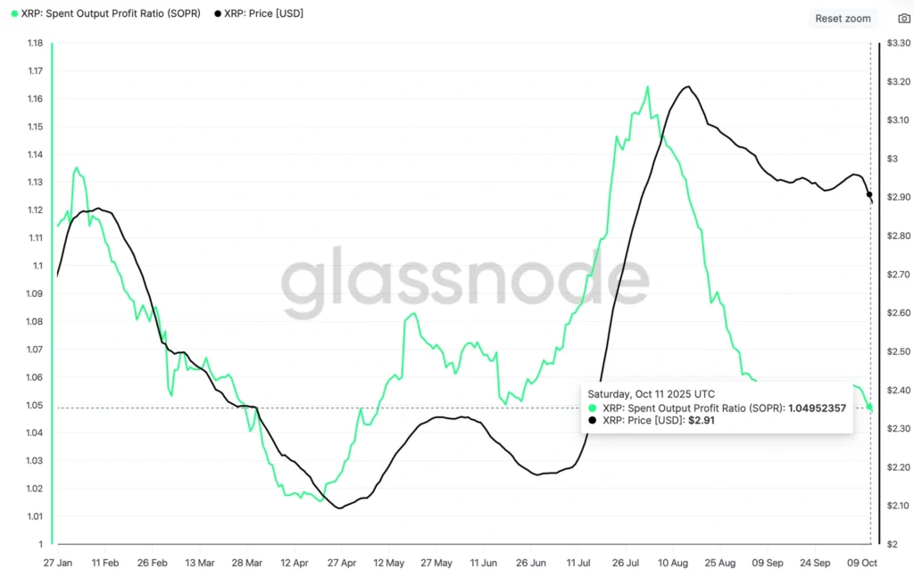 XRP’s Spent Output Profit Ratio (SOPR), which tracks whether holders are selling at a profit or loss, has fallen to 1.04. A drop toward 1.00 typically signals capitulation, where weak holders exit at breakeven or losses.