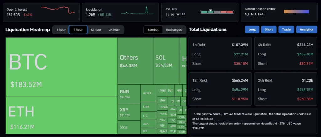 CoinGlass data showed $1.2 billion in liquidations, with $944 million in long positions wiped out — signaling traders are cutting risk.