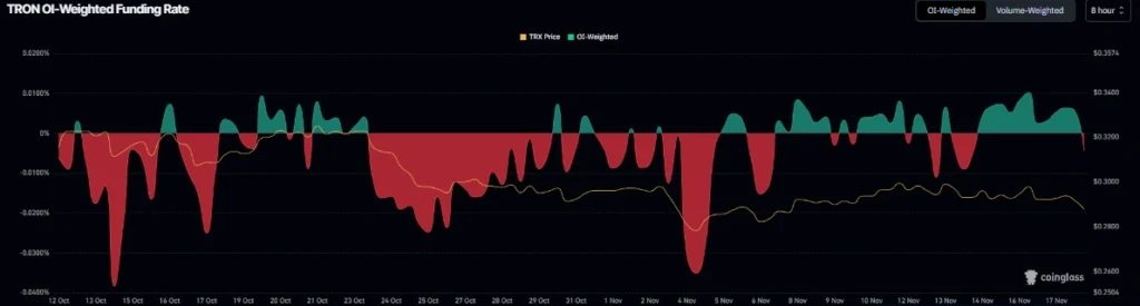 DefiLlama data show Tron’s total value locked fell to 4.58 billion dollars and has been declining since early October. Lower TVL signals slowing activity and reduced user engagement across the Tron ecosystem. Derivatives markets reflect similar caution.