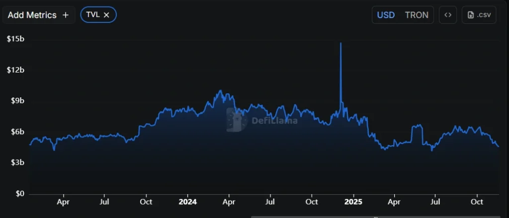 Tron traded below 0.288 on Tuesday. TVL has slipped to 4.58 billion dollars and has been falling since early October, signaling weaker engagement across the Tron ecosystem.