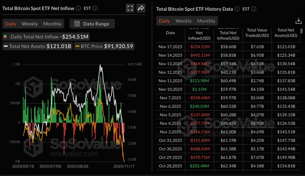 US listed Bitcoin ETFs saw about 255 million dollars in outflows on Monday. Total net inflows stand at 58.6 billion, with 121 billion in net assets. Ethereum ETFs recorded roughly 183 million dollars in outflows, with no inflow days since November 6.