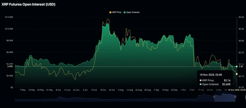 Retail and institutional appetite remains low. The futures Open Interest for XRP averaged 3.6 to 3.78 billion on Tuesday, reflecting subdued positioning. Sideways movement in OI highlights hesitation among traders who are reluctant to commit to fresh exposure until clearer catalysts emerge.
