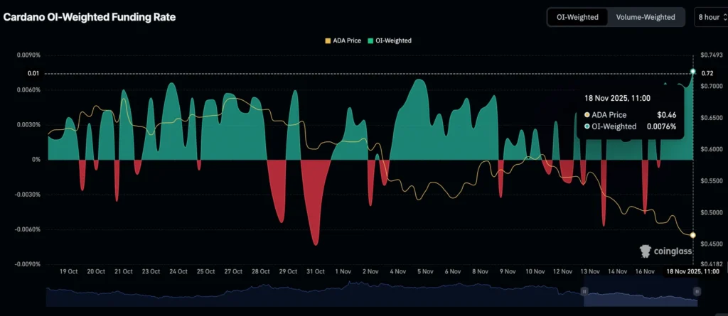 Open interest trends serve as a gauge of market participation. The persistent decline signals lower confidence in ADA and its ecosystem. Funding rates, however, show some stabilization. The OI weighted funding rate has risen to 0.0076 percent, reflecting increased demand for long exposure. Higher readings typically support gradual recovery if broader conditions improve.