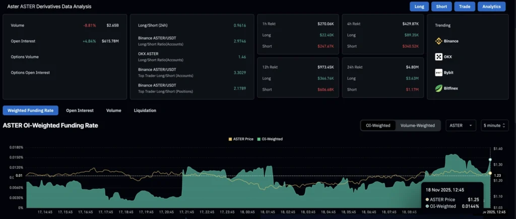 Aster rallied 16 percent on Tuesday after an 8 percent decline the day before. The Binance backed token moved through the 1.2900 supply zone. CoinGlass data show futures open interest up 5 percent to 615.78 million dollars. The funding rate rose to 0.0144 percent, signaling traders are paying a premium to stay long.