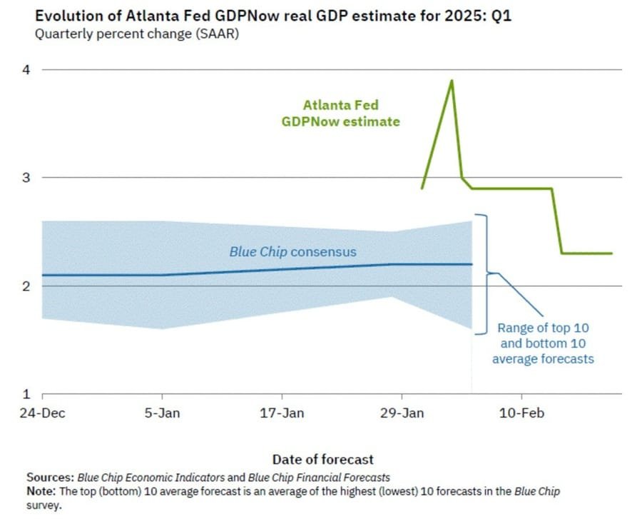 “After this morning’s housing starts report from the U.S. Census Bureau, the GDPNow model estimate for real GDP growth (seasonally adjusted annual rate) in the first quarter of 2025 is 2.3 percent on February 19, unchanged from February 14 after rounding.”