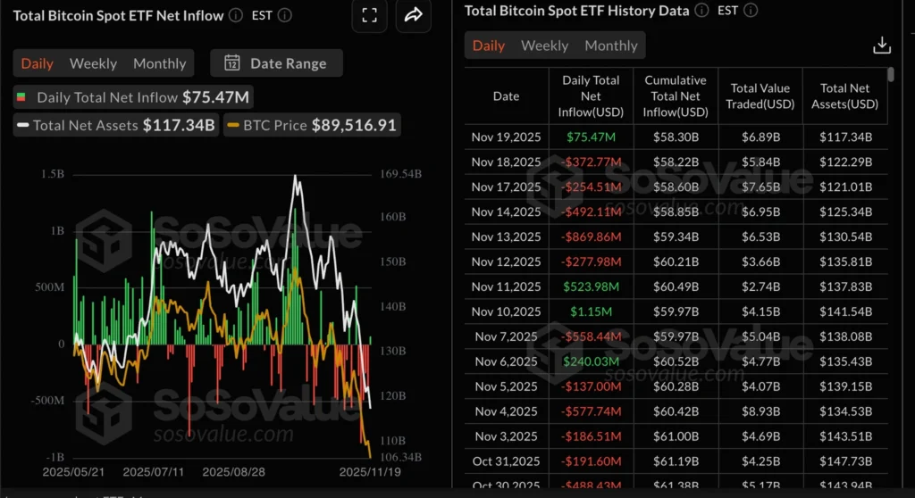 The coin remains well above the April low of 74,434 but is far removed from the 126,272 peak. The market stays vulnerable if forced selling continues.