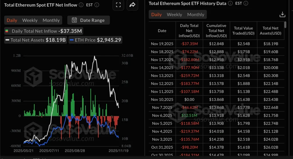 Bitcoin fell almost 5 percent to 86,960, its lowest point since April. The break below the 50 percent retracement of the August rally accelerated liquidations.