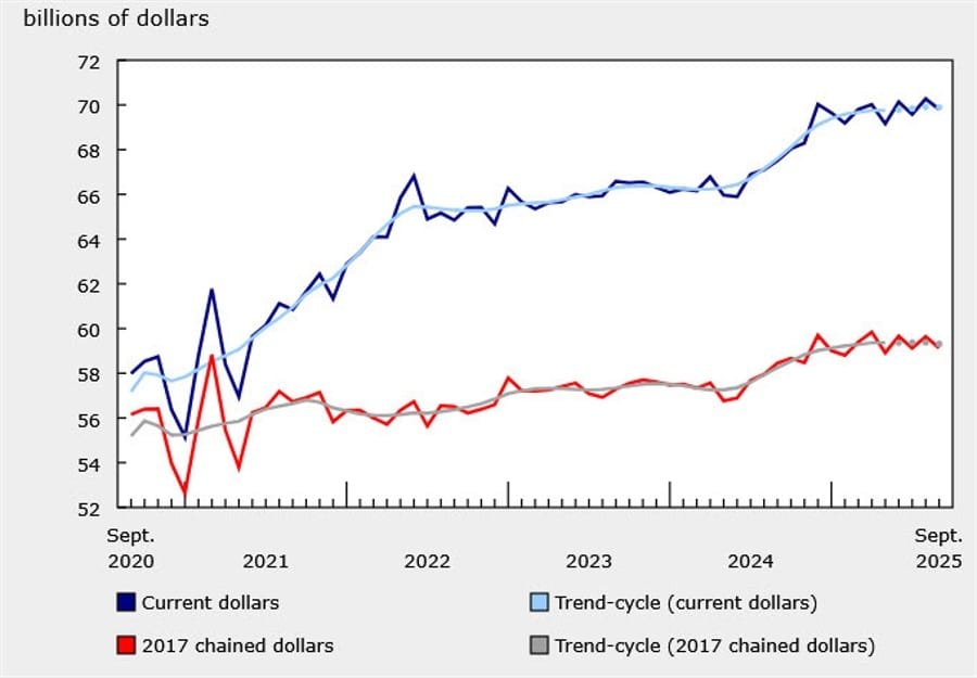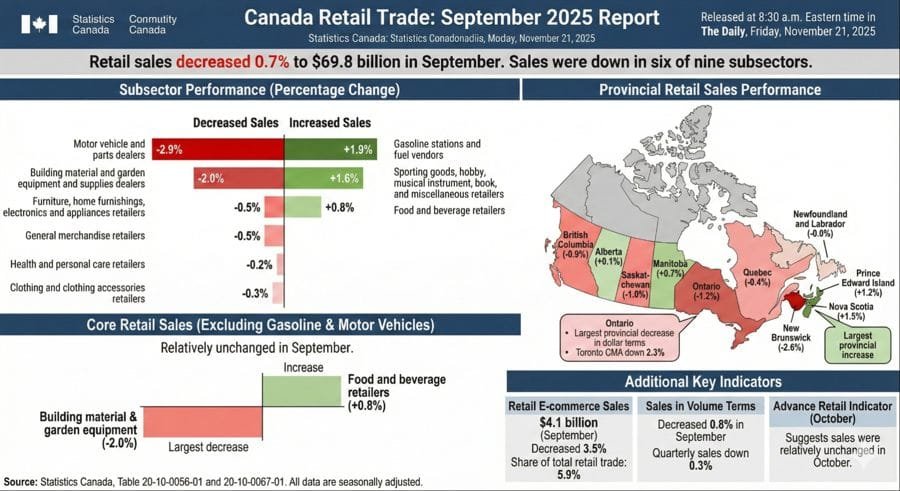 Canada’s September retail sales declined 0.7 percent, matching expectations after a 1.0 percent gain in August. Six of nine subsectors fell, led by autos. Food and beverage rose 0.8 percent. Sales excluding autos increased 0.2 percent against expectations for a 0.5 percent drop. Ex autos and gas registered no change after a 1.1 percent rise. E-commerce sales fell 3.5 percent. Statistics Canada said preliminary October data show sales were relatively unchanged. Retail sales rose 0.2 percent in the third quarter.