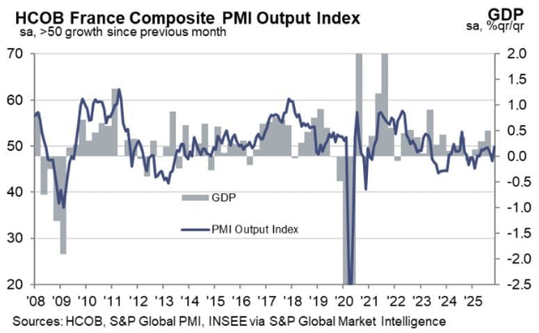 France’s November flash services PMI rose to 50.8, beating expectations for 48.4 and marking a return to expansion. Manufacturing printed 47.8 compared with the 49.0 estimate. The composite index climbed to 49.9, up from 47.7 in October.