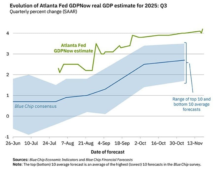 The GDPNow model estimate for real GDP growth (seasonally adjusted annual rate) in the third quarter of 2025 is 4.2 percent on November 21, unchanged from November 19 after rounding. After recent releases from the US Census Bureau, the US Bureau of Labor Statistics, and the National Association of Realtors, a slight decrease in the nowcast of third-quarter real personal consumption expenditures growth was offset by an increase in the nowcast of third-quarter real gross private domestic investment growth from 4.8 percent to 4.9 percent.