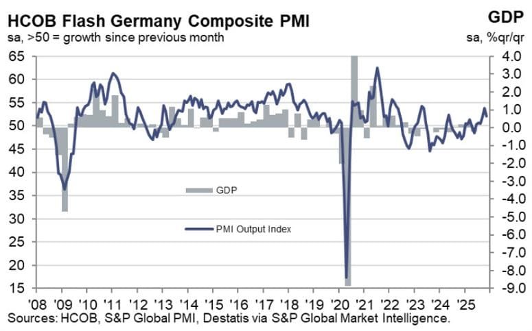 Germany’s November flash PMIs showed a broad loss of momentum. The HCOB manufacturing index fell to 48.4, missing expectations for 49.5 and down from 49.6. Services weakened to 52.7 against a 54.0 forecast and a prior reading of 54.6. The composite index eased to 52.1 compared with expectations for 53.5 and a previous 53.9. Data signalled softer business activity growth heading into year end.