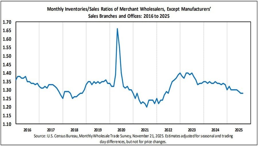US wholesale sales increased 0.1 percent in August, below the 0.4 percent estimate and down from a revised 1.3 percent in July. Inventories were flat against expectations for a 0.2 percent decline. The inventory to sales ratio held at 1.28 months, matching the prior month and remaining near the lowest levels since mid 2022.