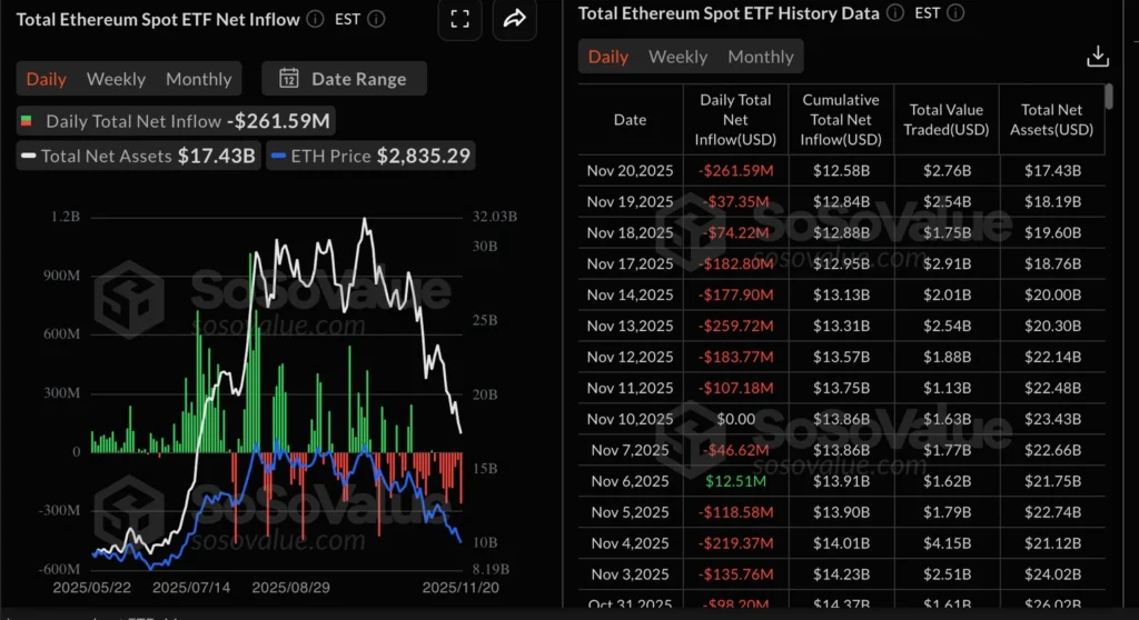 ETH ETFs posted 262 million dollars in outflows. Weak retail demand and persistent institutional selling continue to pressure the market.