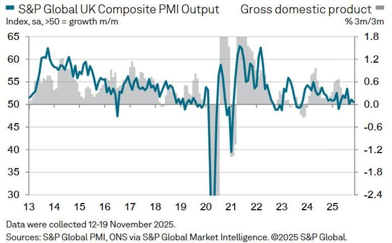 “The PMI data therefore suggest the policy debate will shift further away from inflation worries toward the need to support the struggling economy, hence adding to the chances of interest rates being cut in December.”
