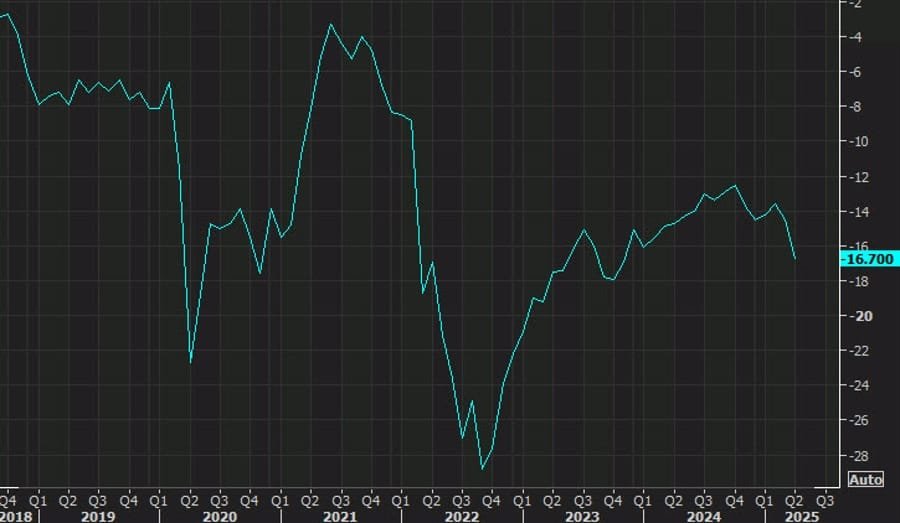 Future six‑month outlooks also weakened to –31.8 (general) and –23.0 (firm), both multi‑year lows.