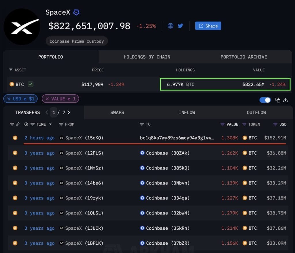 For the first time since June 2022, Elon Musk’s SpaceX moved 1,308 BTC (~$153 million) to a new wallet, signaling renewed interest. The company still holds nearly 7,000 BTC worth ~$823 million.
