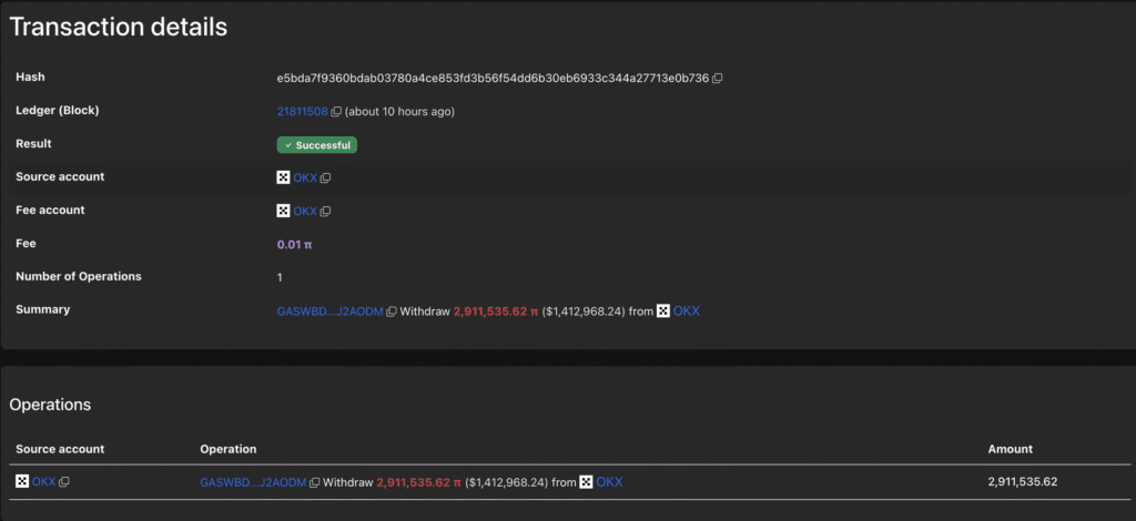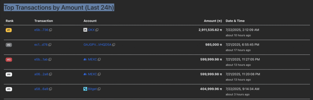 Blockchain tracker PiScan reported a single wallet withdrawing 2.91 million PI tokens (worth ~$1.41M) from OKX, signaling long-term confidence. However, major exchanges like Bitget and MEXC have been offloading PI onto other platforms—raising questions about overhead supply.