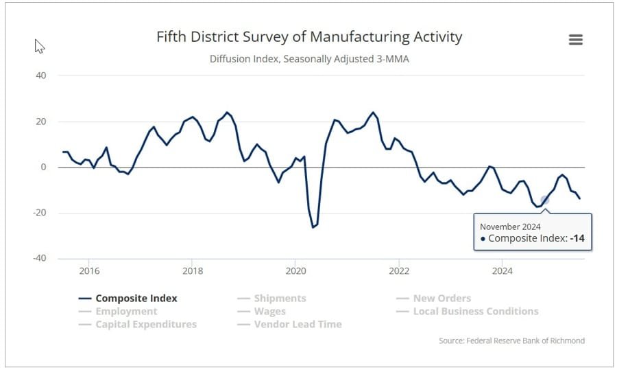 - Richmond Fed manufacturing index plunged to -20, with major declines in shipments, new orders, and employment.