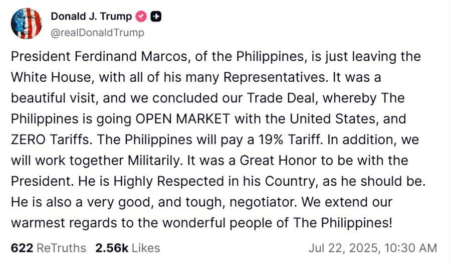 - Trump confirmed a new trade agreement with the Philippines, with: