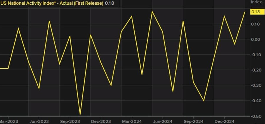 The Chicago Fed’s National Activity Index for February improved to +0.18 from a revised -0.08 in January.