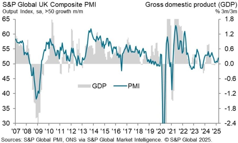“A welcome upturn in service sector activity in March has helped propel stronger economic growth at the end of the first quarter. However, the survey data are indicative of the economy growing at an annualized 1.9% rate in March and just 1.5% over the quarter as a whole, pointing to a slowing of GDP growth compared to the end of 2024.