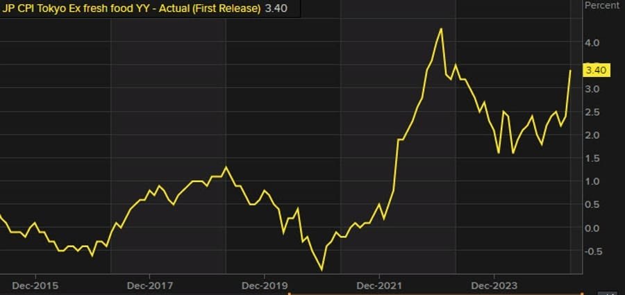 Japan’s Tokyo CPI excluding fresh food rose 3.4% year-on-year in April, beating the 3.2% forecast and marking the first reading above 3% since mid-2023.