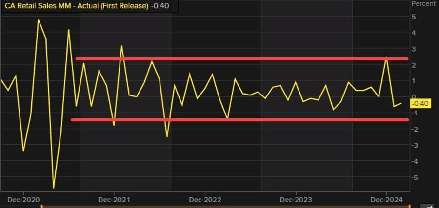 Canadian retail sales fell 0.4% in February, matching expectations. In volume terms, sales were also down 0.4%, with declines recorded in seven provinces.