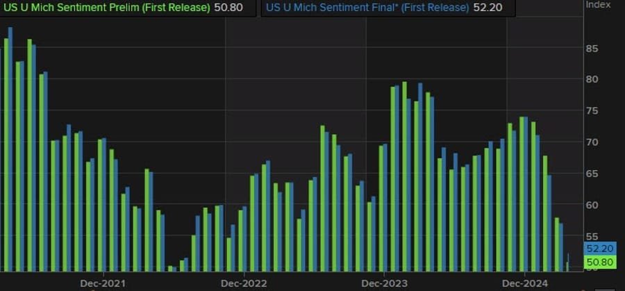 While sentiment improved from the preliminary reading, elevated inflation expectations point to persistent anxiety among consumers despite relatively strong hard data.