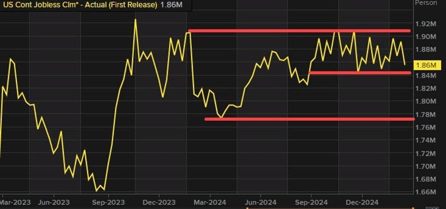 The labor market remains resilient, though continuing claims have held steady between 1.84M and 1.91M since September.