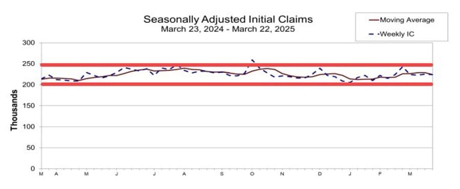 - 4-week moving average steady at 224K, well within the 200K–250K range seen over the past year.