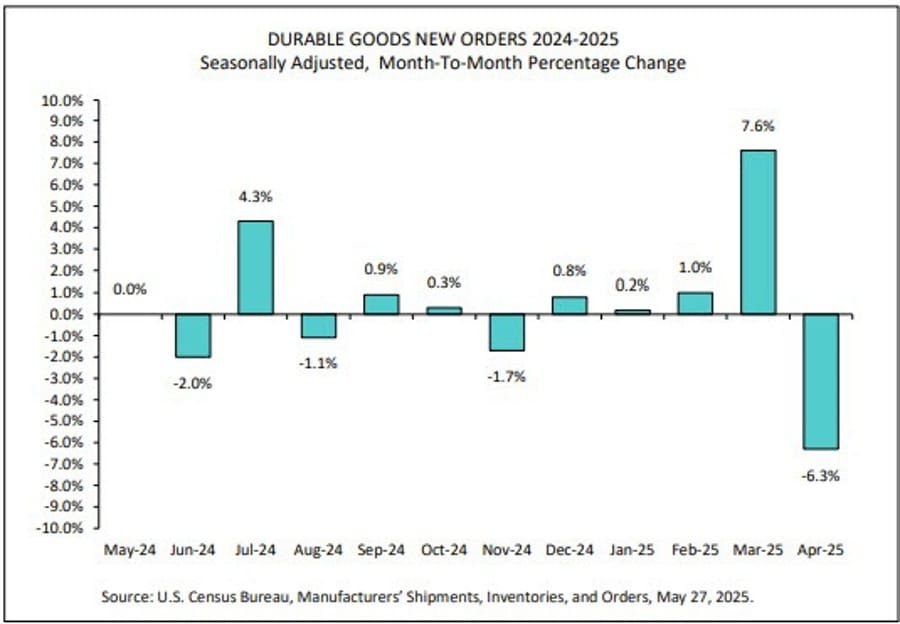 New data from the Census Bureau shows U.S. durable goods orders declined by 6.3% in April, coming in slightly better than the -7.8% forecast, but still reversing a strong 7.6% increase in March. The drop was driven heavily by transportation, especially aircraft orders, which caused overall volatility.