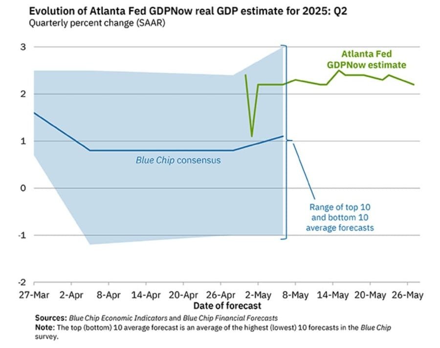 The Atlanta Federal Reserve’s latest GDPNow model update shows estimated Q2 2025 U.S. GDP growth has been revised slightly downward to 2.2%, down from 2.4% in the previous reading.