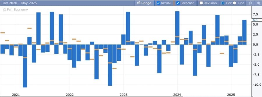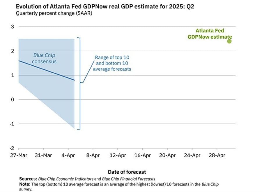 Following the disappointing Q1 GDP print of -0.3%, the Atlanta Fed’s GDPNow model projects Q2 2025 growth at 2.4%. That’s a sharp contrast to Q1, which saw weakness in consumer spending and net trade. The “gold-adjusted” estimate for Q1 from the Atlanta Fed had been -1.5%, closer to the official release than market consensus. The Q2 forecast suggests a potential rebound, but markets will watch closely for May’s data to confirm that.