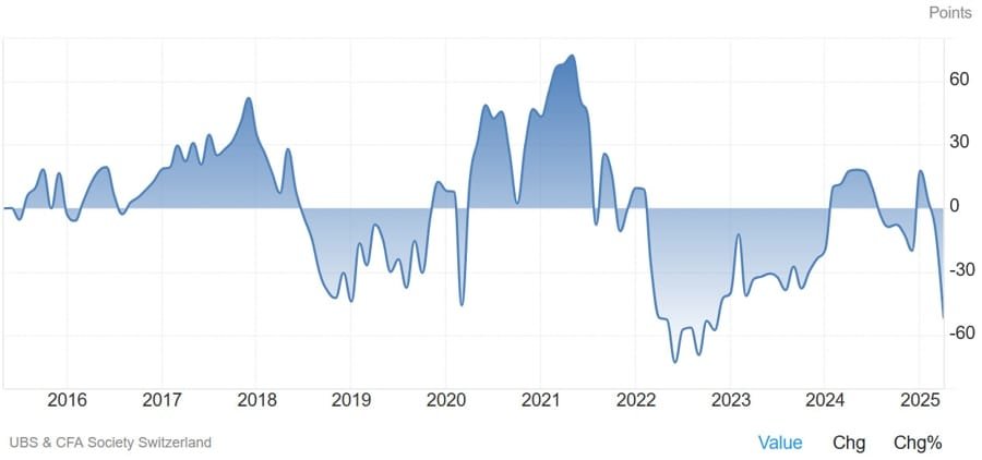 This is the first full reading since Trump’s major tariff announcement on April 2, and the data reflects a notable deterioration in forward-looking confidence and domestic expectations.