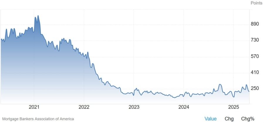 According to the Mortgage Bankers Association, US mortgage applications fell -4.2% in the week ending April 25, following a -12.7% decline the previous week.