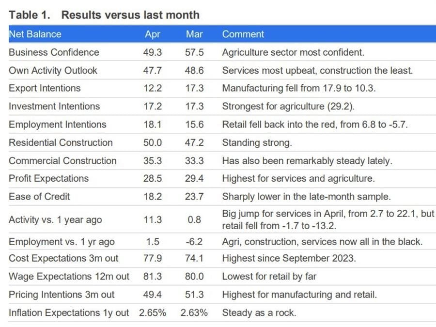 The ANZ Business Outlook Survey showed a sharp decline in sentiment in April: