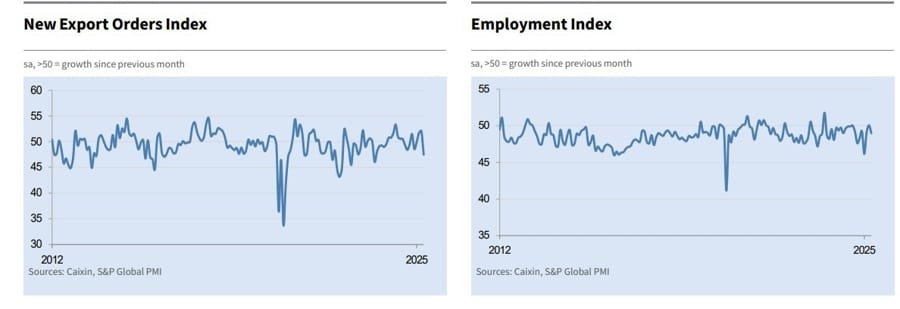 Weak Chinese PMIs Add to Concerns: Both official and Caixin manufacturing indices signaled contraction or barely-there growth. Export orders fell sharply, and business confidence tumbled.